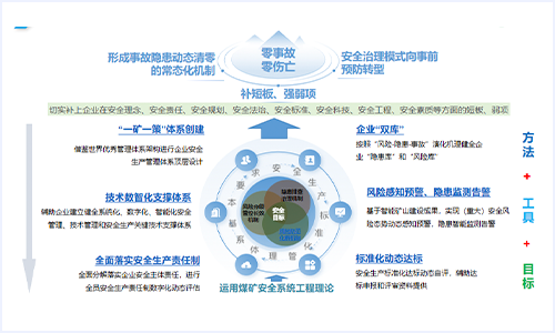 煤礦安全生產(chǎn)保障支撐體系是充分研究借鑒國際通用的安全管理體系架構(gòu),以國家法律法規(guī)、技術(shù)標(biāo)準(zhǔn)為基礎(chǔ),運(yùn)用煤礦安全系統(tǒng)工程理論,構(gòu)建以安全目標(biāo)為引領(lǐng),風(fēng)險(xiǎn)分級(jí)管控、隱患排查治理和風(fēng)險(xiǎn)防范化解三大機(jī)制構(gòu)建為核心,以安全生產(chǎn)標(biāo)準(zhǔn)化管理體系基本要求為主線,通過體系、雙庫建設(shè)的方式方法,借助安全、技術(shù)等數(shù)智化保障支撐工具,實(shí)現(xiàn)安全生產(chǎn)責(zé)任制全面落實(shí)、標(biāo)準(zhǔn)化動(dòng)態(tài)達(dá)標(biāo)的目標(biāo)。切實(shí)補(bǔ)上煤礦在安全管理方面的短板、弱項(xiàng),最終實(shí)現(xiàn)“零事故、零傷亡”的宏偉目標(biāo)。
